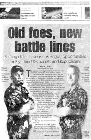 “We meet with our supporters all the time,” said Smith, who’s working exclusively this year on the U.S. Senate campaign of former GOP Gov. Linda Lingle. The Lingle campaign staged sign-waving events Friday afternoon in Hilo and Kona, and most of the island’s GOP candidates will be gathering at Lingle headquarters in Hilo and Kona tonight to watch the primary election returns roll in, he said. “We’re keeping it local.”"